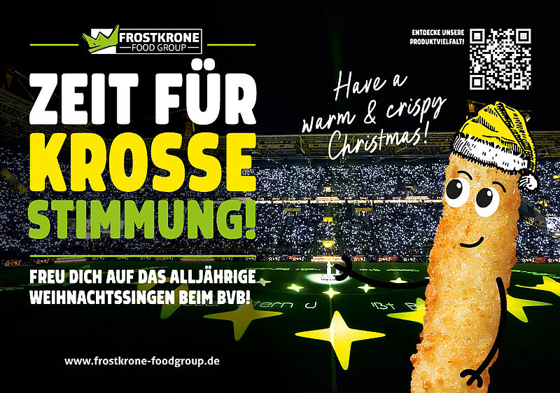 Rietberg, 26. November 2025. 70.000 Stimmen, Gänsehaut-Atmosphäre und ein Stadion voller Lichter: Frostkrone unterstützt auch in diesem Jahr das große BVB-Weihnachtssingen im SIGNAL IDUNA PARK – eine Aktion zugunsten sozialer Projekte. Am 30. November um 16:30 Uhr ist es wieder so weit. Prominente Unterstützung erhalten die Besucher:innen in diesem Jahr von Yvonne Catterfeld, Alexander Klaws, Jo Marie Dominiak und Blumengarten. Seit über fünf Jahren begleitet die Frostkrone Food Group diese besondere karitative Veranstaltung als Partner.